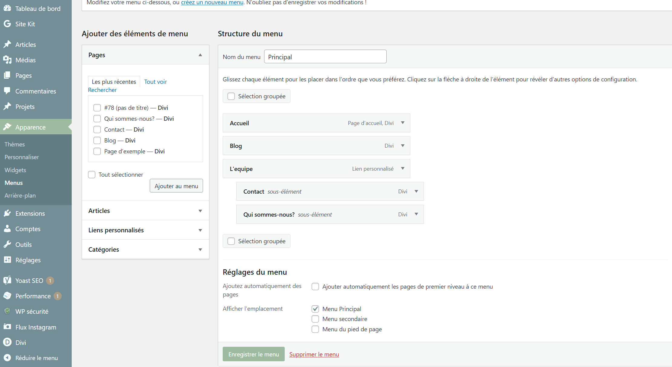 On clique ensuite sur « Enregistrer le menu ». Il s’affichera désormais sur toutes les pages du site.